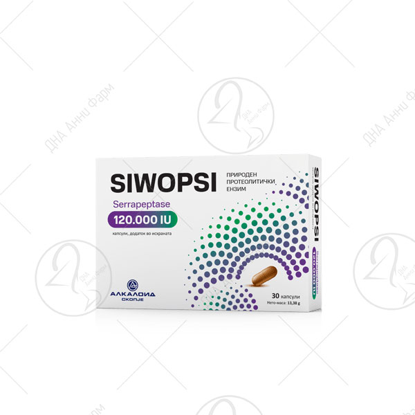 SIWOPSI® е додаток во исхраната во форма на етерично обложени капсули, кој го содржи протоеолитичкиот ензим серапептаза.